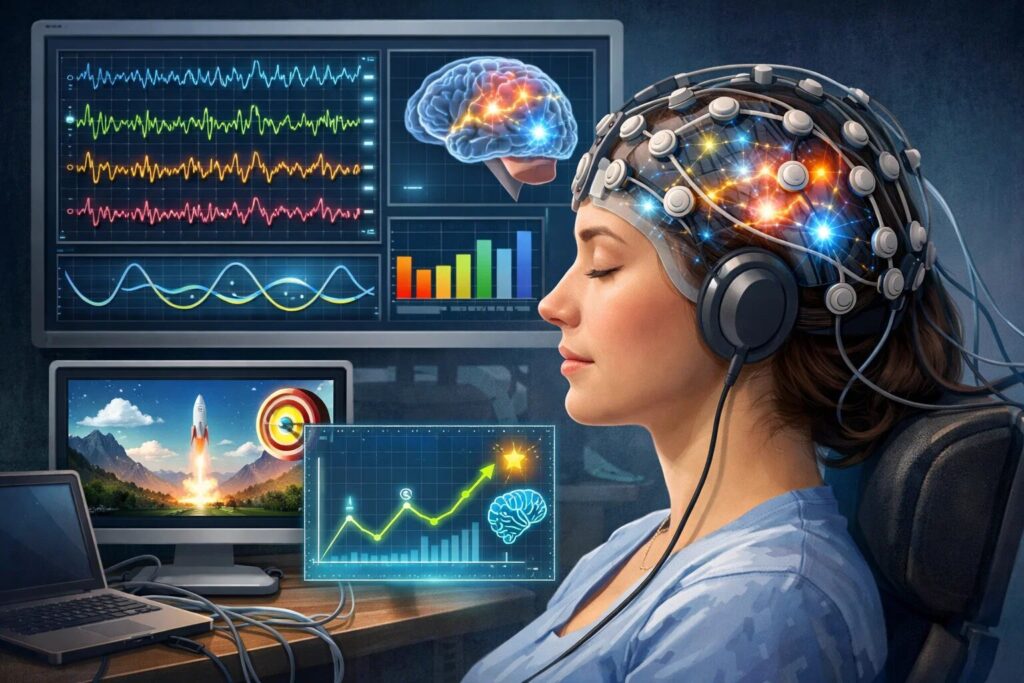Neurofeedback is biofeedback, maar dan specifiek met hersensignalen. Meestal gaat het om EEG: plakkers op je hoofd meten elektrische activiteit, en een computer vertaalt die activiteit in directe feedback. Dat kan een bewegende balk zijn, een toon die hoger of lager wordt, of een game die alleen “goed loopt” als je hersenactiviteit binnen een bepaald patroon blijft.
