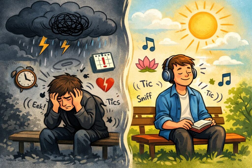 Tics reageren vaak op spanning. Niet alleen emotionele spanning, ook lichamelijke: slechte slaap, honger, overprikkeling, haast.